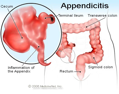 Swollen appendix. If left untreated it often leads to death. It appears to be the result of an obstruction that